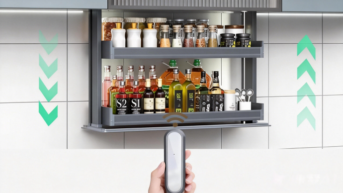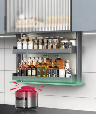 This smart electric lift-up cabinet features a vertical lifting design to maximize overhead kitchen space and provide concealed, easy-access storage. It integrates touch control, voice control, and intelligent lighting for intuitive operation. Equipped with a high-performance motor and safety anti-collision system, it supports up to 30kg load with smooth and quiet movement, ideal for storing food, beverages, and kitchen essentials.