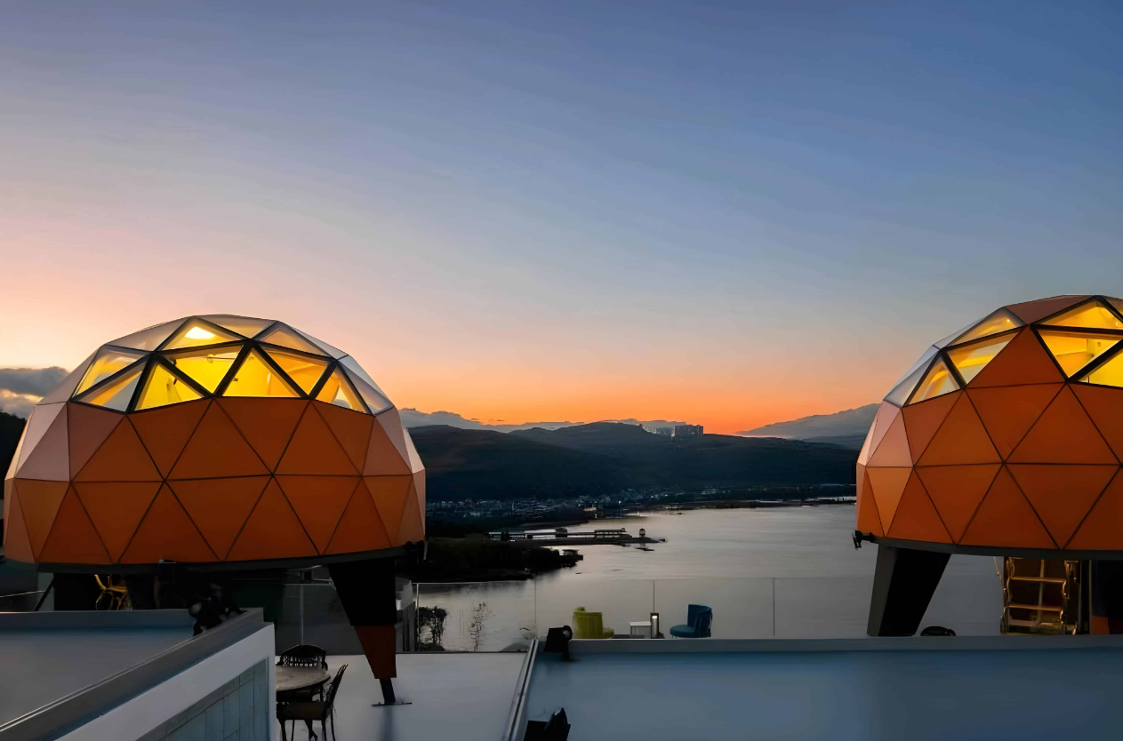 The Starry Sky Cabin features a celestial theme that blends sci-fi aesthetics with natural elements, embodying technological innovation and eco-consciousness. The ceiling and most walls are constructed from high-strength transparent materials, offering an unobstructed 180° to 270° panoramic view. Guests can lie in bed and gaze directly at the starry sky and night sky without any barriers.