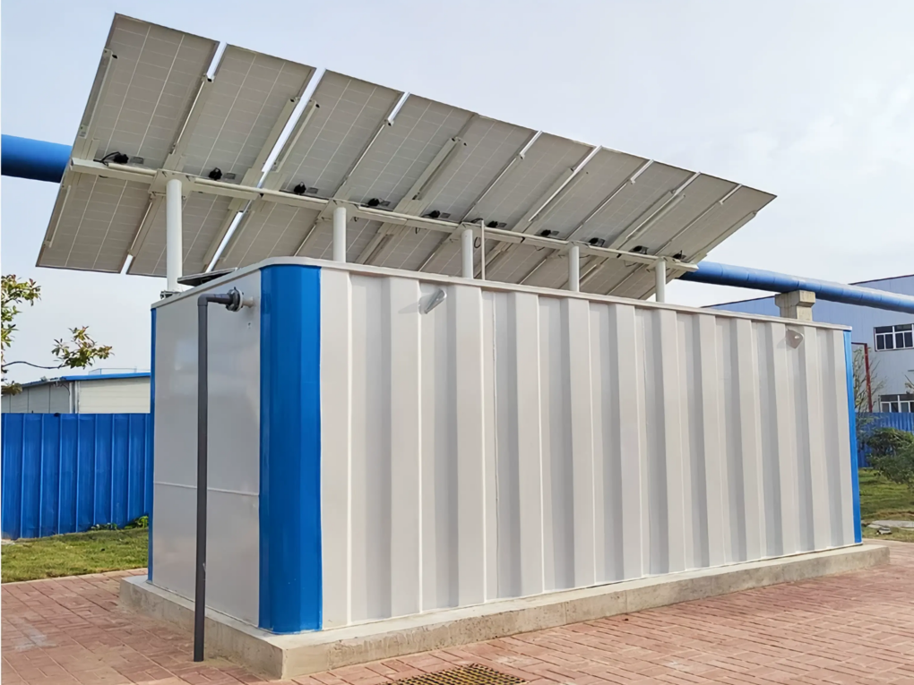 This solar-powered integrated wastewater treatment system is specially designed for small-scale decentralized domestic sewage treatment, combining equalization, biological treatment, and membrane filtration (MBR) in a compact unit. The main body is constructed from carbon steel with anti-corrosion coating and welded fabrication, providing high structural strength, excellent sealing, and long-term reliable operation. Its compact design allows flexible installation in areas without grid power or with unstable electricity supply.