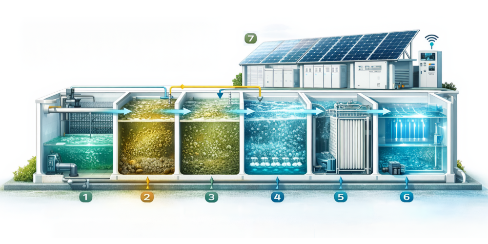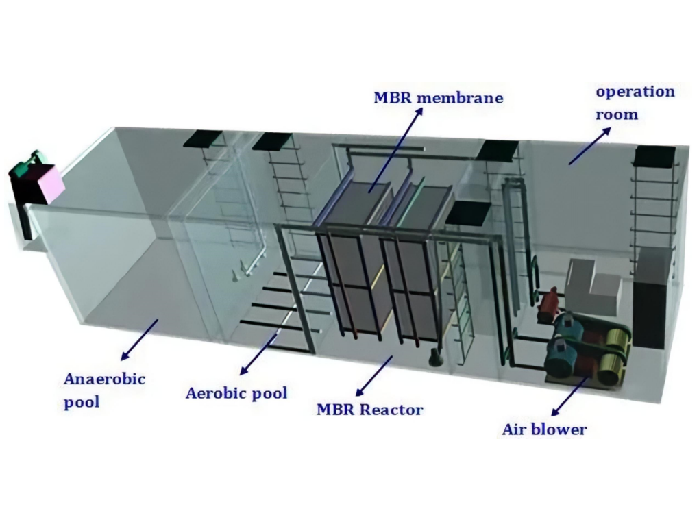 In terms of process, the system adopts an “Anoxic + Aerobic + MBR” configuration, delivering stable effluent quality and strong resistance to load fluctuations. For long-term reliable performance, it is recommended to install a three-chamber septic tank upstream as a pretreatment unit. This removes large solids and reduces organic load through sedimentation and anaerobic digestion, minimizing membrane fouling and extending service life.