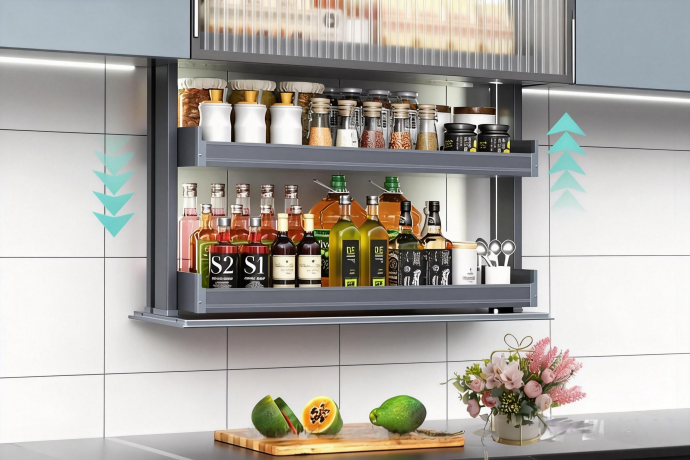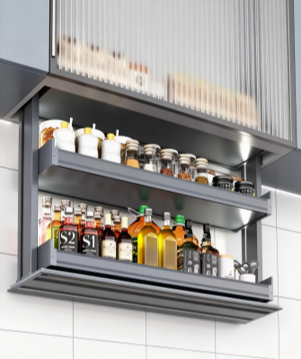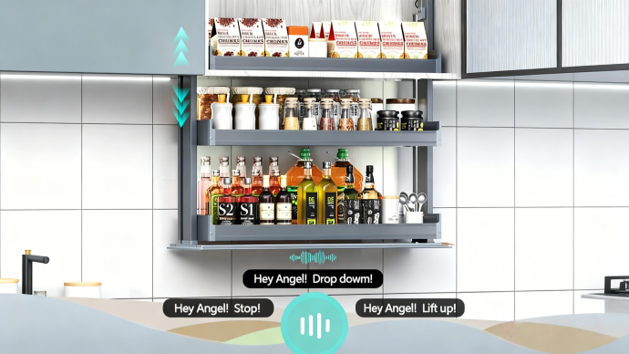 This smart electric lift-up cabinet features a vertical lifting design to maximize overhead kitchen space and provide concealed, easy-access storage. It integrates touch control, voice control, and intelligent lighting for intuitive operation. Equipped with a high-performance motor and safety anti-collision system, it supports up to 30kg load with smooth and quiet movement, ideal for storing food, beverages, and kitchen essentials.