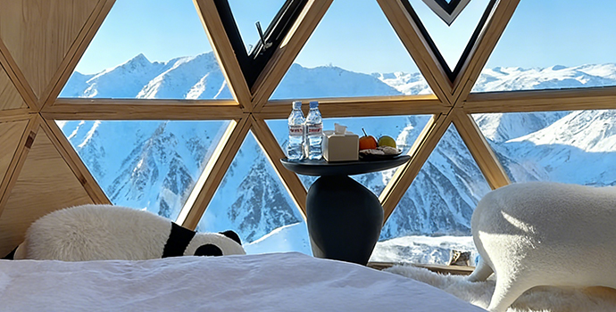 The Starry Sky Cabin features a celestial theme that blends sci-fi aesthetics with natural elements, embodying technological innovation and eco-consciousness. The ceiling and most walls are constructed from high-strength transparent materials, offering an unobstructed 180° to 270° panoramic view. Guests can lie in bed and gaze directly at the starry sky and night sky without any barriers.